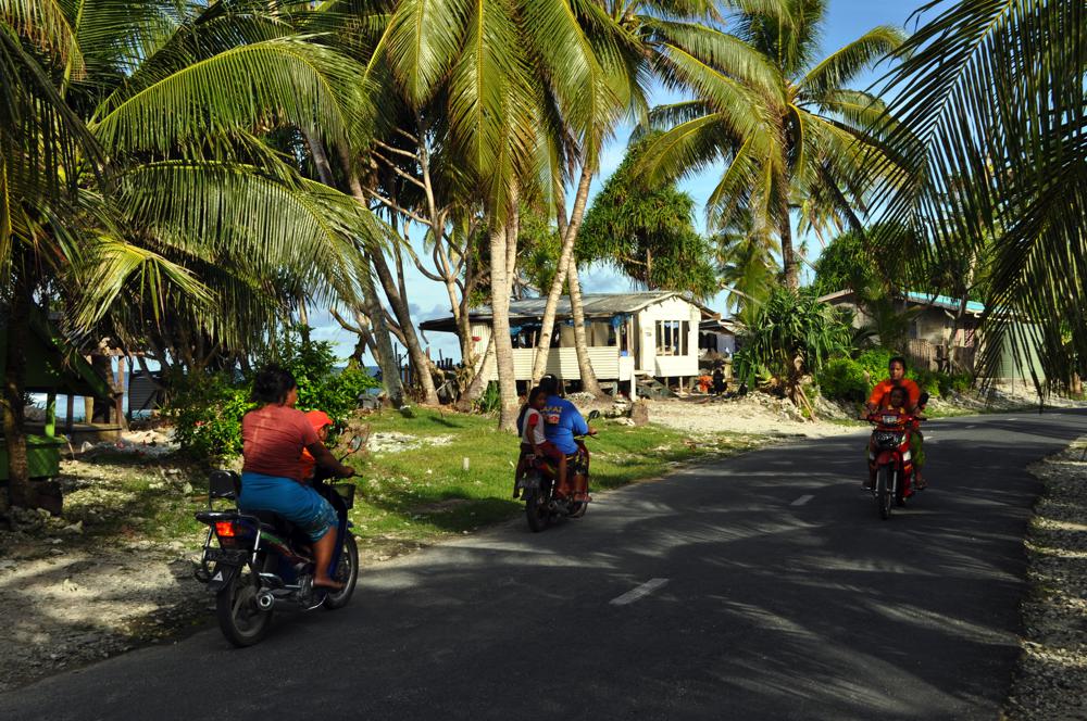 Fongafale Island a boomerang-shaped island around 10km long, but often no more than 50 metres or so wide. Only where the town and runway are located does the island open up to a few hundred metres wide. This means that there is only one road running along the spine of the island. This photo set shows daily scenes along the streets of Vaiaku town, and along the road up and down the island.